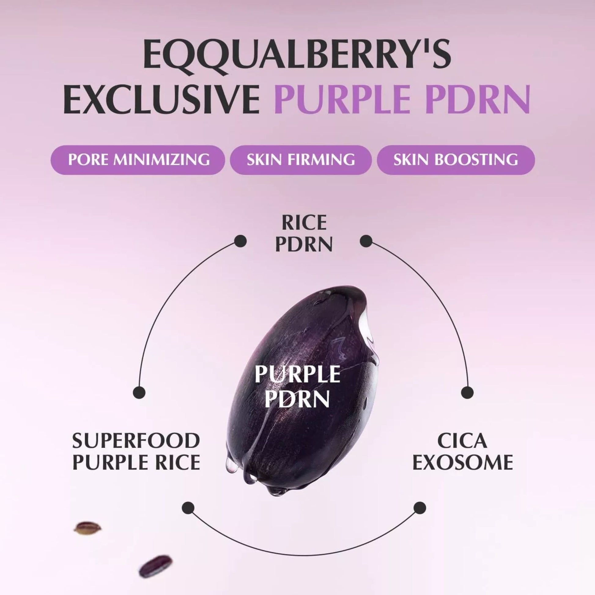 The EQQUALBERRY Purple PDRN Pore Minimizing Serum is a fast-absorbing, skin-refining treatment designed to minimize the appearance of enlarged pores while improving overall skin texture and hydration. Formulated with 30,000 ppm of Purple PDRN—a powerful blend of rice-derived PDRN, cica exosomes, and antioxidant-rich purple rice—it supports skin regeneration and elasticity. This lightweight serum also includes niacinamide, PHA, ceramides, and hyaluronic acid to gently exfoliate, brighten, and deeply moisturize without irritation.