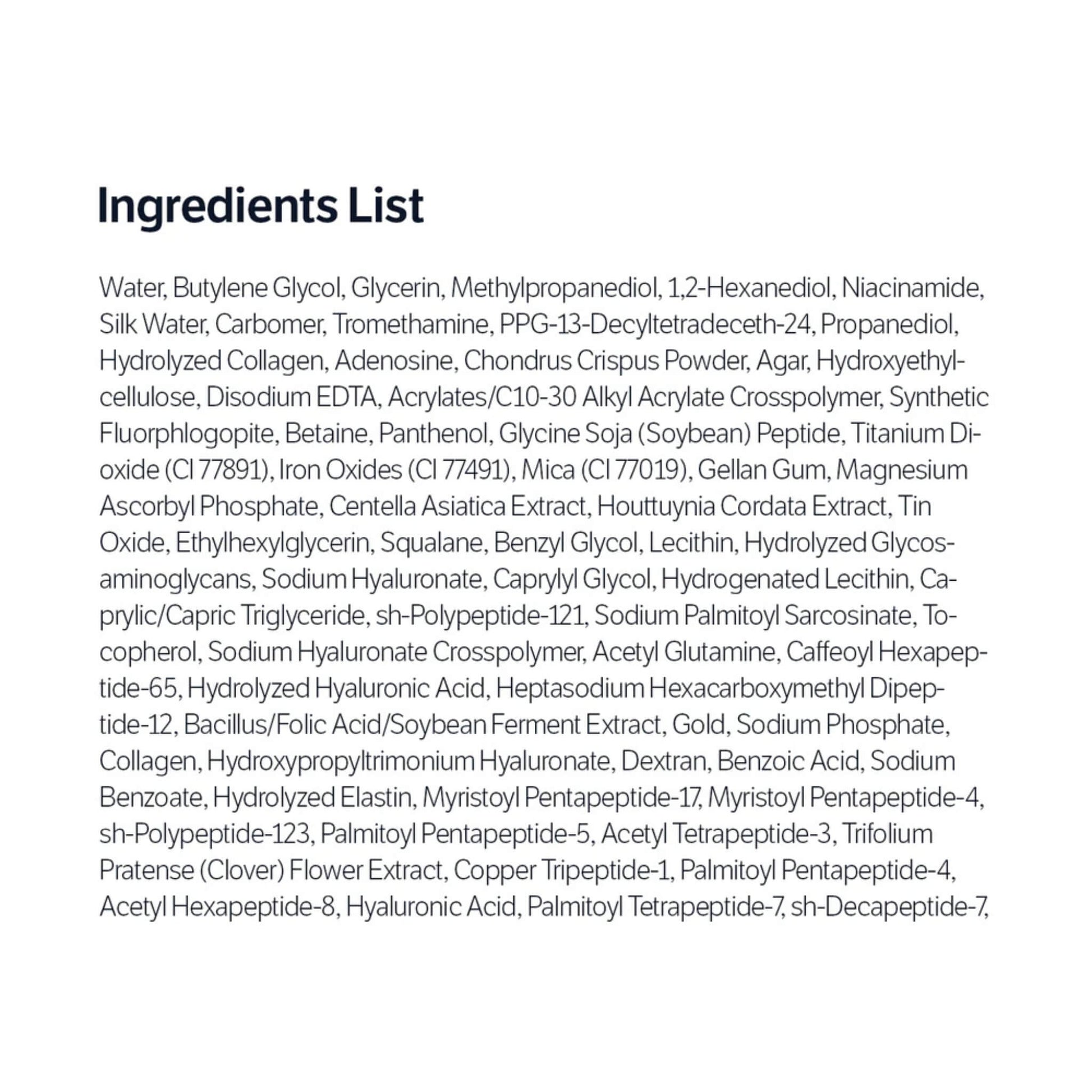 Water, Butylene Glycol, Glycerin, Methylpropanediol, 1,2-Hexanediol, Ethylhexylglycerin, Silk Extract, Hydrolyzed Collagen, Peptide Complex, Sodium Hyaluronate, Betaine, Panthenol, Centella Asiatica Extract, Houttuynia Cordata Extract, Tocopherol, Carbomer, Tromethamine, Disodium EDTA, Synthetic Fluorphlogopite, Titanium Dioxide (CI 77891), Iron Oxides (CI 77491), Mica, Gellan Gum, Lecithin, Hydrolyzed Elastin, Hydrolyzed Glycosaminoglycans, Caprylyl Glycol, Hydrogenated Polyisobutene, Squalane, Phenoxyethanol, Fragrance.